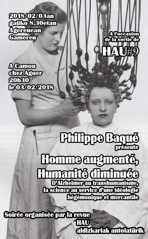 Hau aldizkariak bere 9. aldizkariaren argitalpenaren ospatzeko gaüaldi bat antolatzen dü Gamereko ostatüan. Gaüaldi hontara, « l’Homme augmenté, l’humanité diminué » geiaz mintzatzeko, Philippe Baqué idazlea jinen da. Gei hori jorratü dü bere azken libürüan ; hortan, ikerka bat joanarazten dü dü, bere bizian hoinarritzez. Ondorioztatzeetan, erakusten dü, zientzia, osagarri sailean ere, merkatü eta sosaren zerbütxüko jarririk dela. Gaüaldia, arratseko 20:30etan abiatüko da Gamereko ‘Agerria' ostatüan. Philippe Baqué :