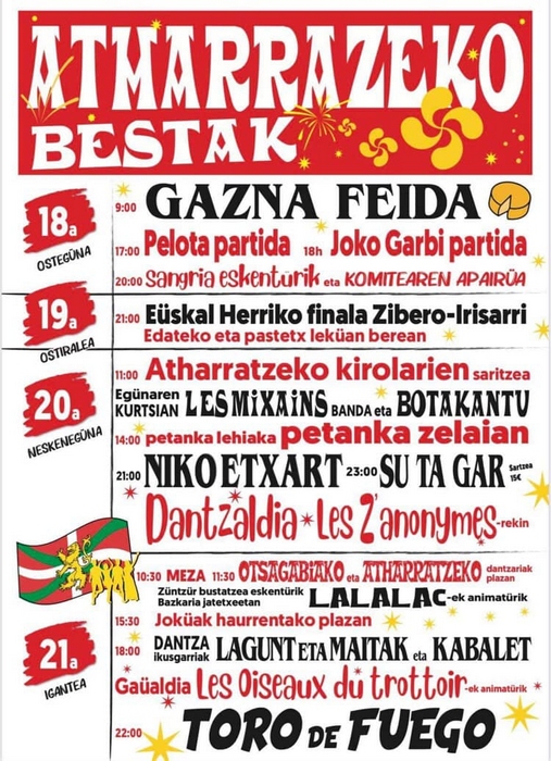 Lehenik agorrilaren 18an gazna feida. Pelota partida 6etarik goiti eta ondotik besta batzordeak aihari bat antolatzen dü.